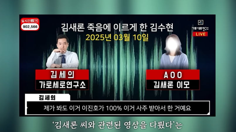 가세연이 김새론의 유족과의 통화 내용을 공개하며 김수현을 지목했다.