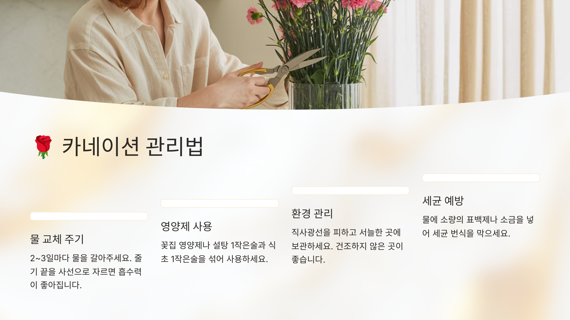 - 물 갈 때는 줄기 끝을 사선으로 잘라 흡수력을 높여주세요.