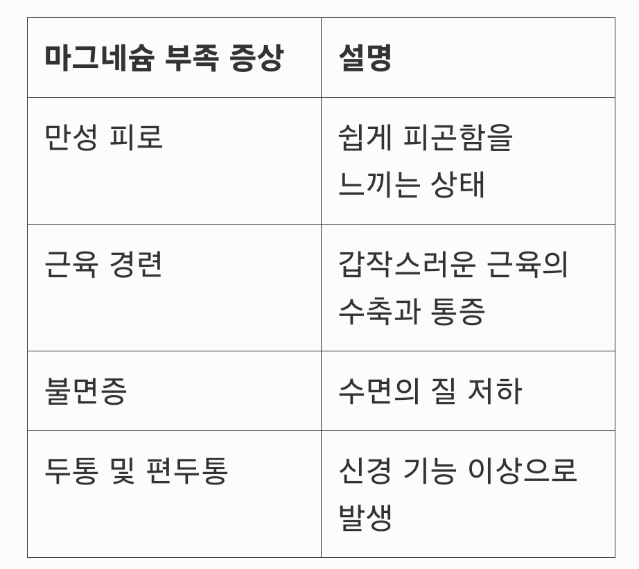 마그네슘은 몸의 에너지 대사와 근육 및 신경 기능을 돕는 필수 미네랄입니다. 마그네슘이 부족하면 다음과 같은 증상이 나타날 수 있습니다: